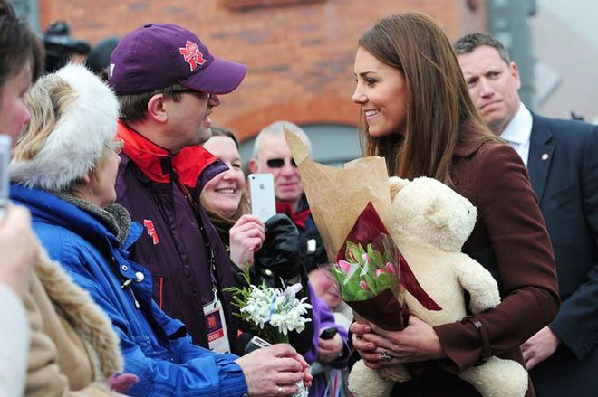 (Επίσκεψη της Κέιτ Μίντλεντον το Grimsby στις 6 Μαρτίου. Η Δούκισσα του Κέιμπριτζ κρατά στην αγκαλιά της το αρκουδάκι που της προσέφεραν πολίτες ως δώρο)