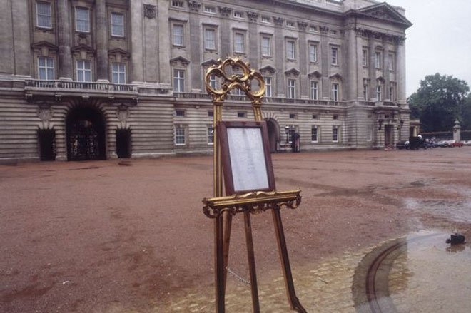 Το Παλάτι του Μπάκιγχαμ εξέδωσε ανακοίνωση, την οποία και τοποθέτησε σ’ ένα καβαλέτο στο προαύλιο του παλατιού.