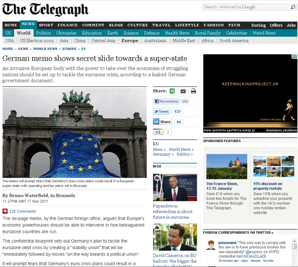 Η εφημερίδα «The Daily Telegraph» δημοσίευσε ένα εξασέλιδο κείμενο που αποδίδει στο γερμανικό ΥΠΕΞ και το οποίο σημειώνει ότι η «μερική πτώχευση» θα πρέπει να καταστεί μια δυνατότητα που θα μπορεί να εφαρμοστεί για τα κράτη-μέλη της ευρωζώνης τα οποία «δεν είναι σε θέση να επιτύχουν την βιωσιμότητα του χρέους» τους.