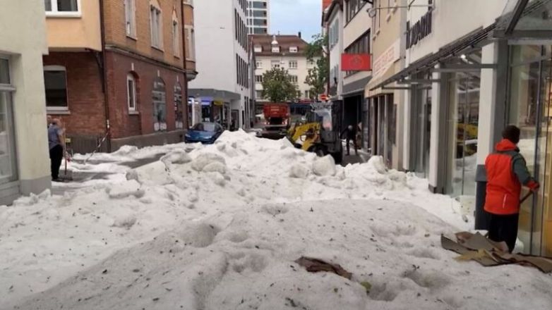 Στο απόγειο του καλοκαιριού στο βόρειο ημισφαίριο, τα εκχιονιστικά μηχανήματα βγήκαν στους δρόμους της νοτιοδυτικής Γερμανίας καθώς βίαιη καταιγίδα άφησε τεράστιες ποσότητες χαλαζιού.