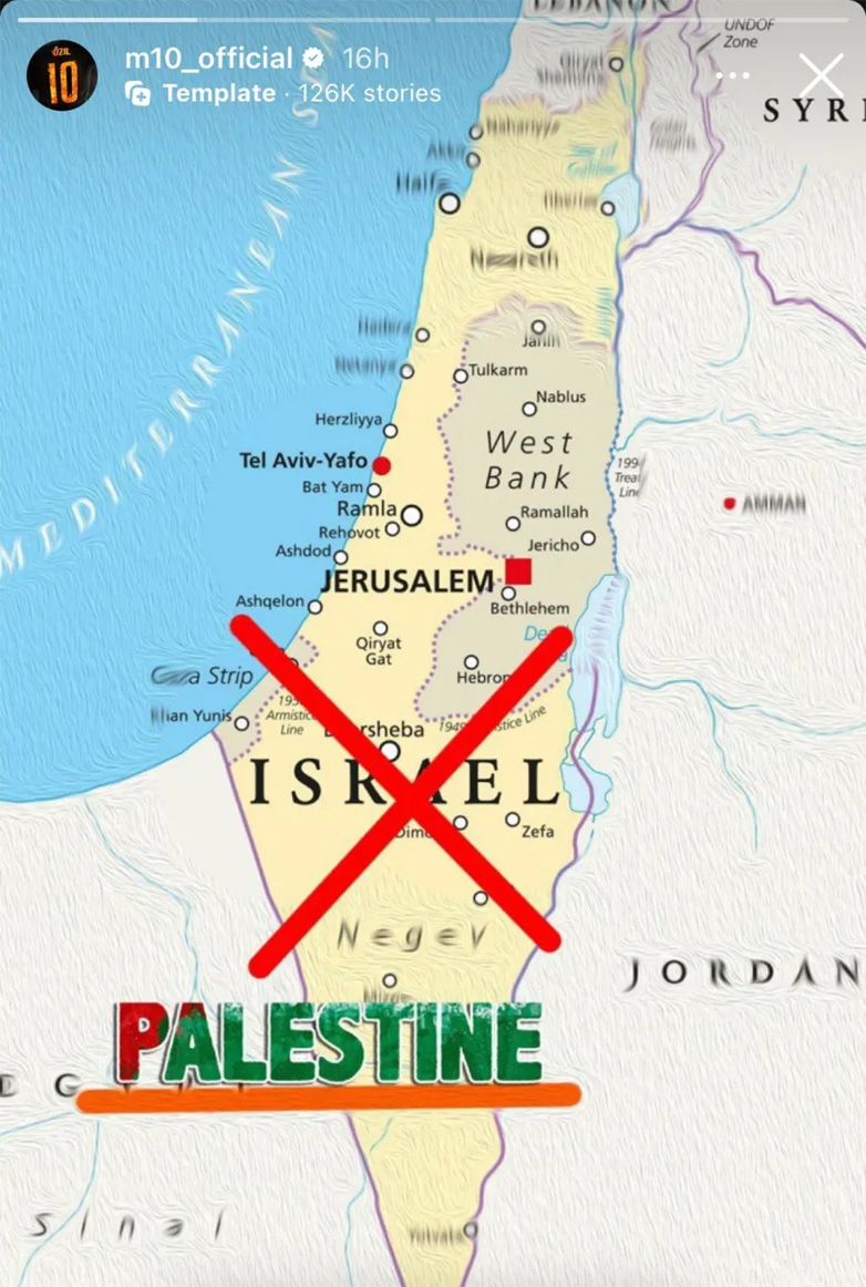 Μέσω Instagram o τουρκικής καταγωγής ποδοσφαιριστής δημοσίευσε χάρτη του Ισραήλ, στον οποίο έχει διαγραφεί με κόκκινο Χ η λέξη Ισραήλ και έχει γραφτεί με μεγάλα γράμματα η λέξη Παλαιστίνη.