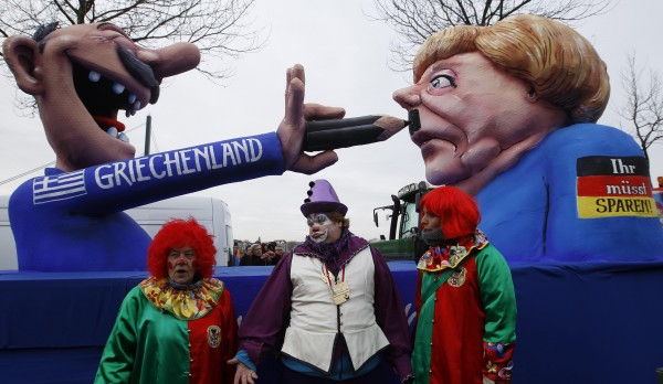 Στο άρμα απεικονίζεται ένας Ελληνας να ζωγραφίζει στο πρόσωπο της Γερμανίδας Καγκελαρίου, ένα μουστάκι παρόμοιο με αυτό του Αδόλφου Χίτλερ. Πάνω στον ώμο της Άγκελας Μέρκελ αναγράφεται η φράση: «Πρέπει να μαζέψετε λεφτά».