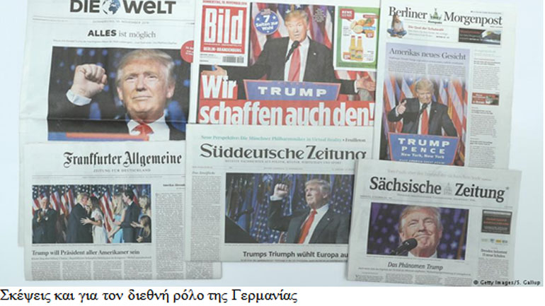 Η «Tagesspiegel» του Βερολίνου ασχολείται με τις επιπτώσεις της εκλογής του Ντόναλντ Τραμπ στον εξωτερικό τομέα και ειδικά για την Ευρώπη και τη Γερμανία: «Η εξωτερική πολιτική του Τραμπ θα είναι διαποτισμένη από τον απομονωτισμό περισσότερο από όσο αυτή του προέδρου Ομπάμα. Κατά τη βούληση του νέου προέδρου οι ΗΠΑ πρέπει να ξαναβρούν τον εαυτό τους, την παλιά τους δύναμη, εννοείται και στον στρατιωτικό τομέα, όμως όχι ως ηγέτιδα δύναμη της Δύσης, αλλά για τη δική τους ασφάλεια και για την επιβολή των δικών τους συμφερόντων. (…) Μετά την κατάρρευση της Σοβιετικής Ένωσης οι χώρες της Δύσης και πρωτίστως η Γερμανία είχαν επωφεληθεί από τον μαζικό αφοπλισμό. Τώρα ήρθε η ώρα να επενδύσουν πάλι στην αμυντική πολιτική τα όσα εξοικονόμησαν από την ειρήνη. Κανένας δεν θα μας παίρνει πια από το χέρι. Η Ευρώπη θα υποχρεωθεί να μάθει να περπατάει μόνη της».
