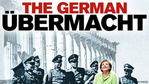 Σε εξώφυλλο του περιοδικού «Spiegel» η Άνγκελα Μέρκελ εμφανίζεται σε μία επεξεργασμένη φωτογραφία αξιωματικών των ναζί με φόντο τον Παρθενώνα την περίοδο της γερμανικής Κατοχής. Στο επάνω μέρος της δεσπόζει ο τίτλος «Η γερμανική υπερδύναμη», αντιπροσωπευτικός του τρόπου με τον οποίο αντιλαμβάνονται αρκετοί Ευρωπαίοι τον ρόλο της σύγχρονης Γερμανίας.