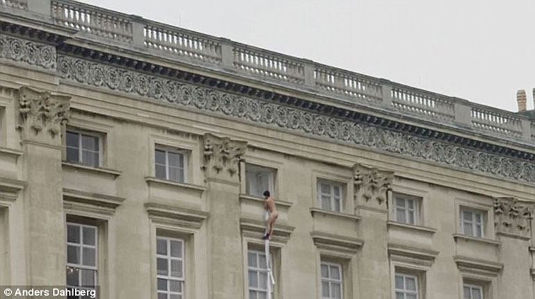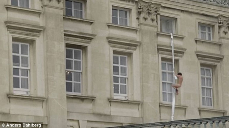 Όπως φαίνεται και στα πλάνα που ακολουθούν, με τη βοήθεια ενός αυτοσχέδιου σχοινιού από σεντόνια, ο γυμνός άνδρας προσπαθεί να κατέβει από παράθυρο του παλατιού. Ωστόσο, το αυτοσχέδιο σχοινί υποχωρεί υπό το βάρος του άνδρα, ο οποίος κάνει βουτιά στο κενό από ύψος αρκετών μέτρων.