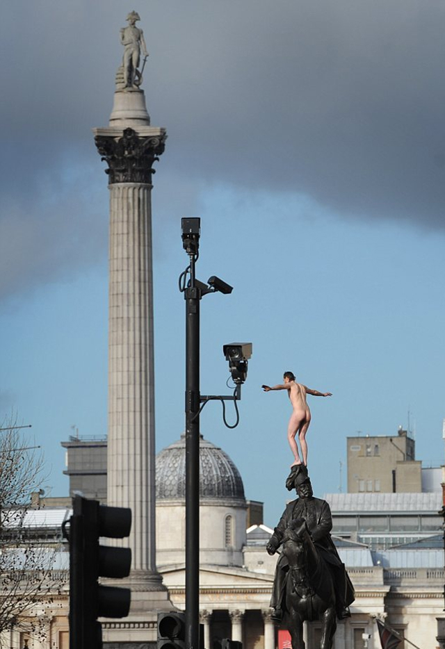 Απίστευτες εικόνες εκτυλίχθηκαν το μεσημέρι της Παρασκευής στο κέντρο του Λονδίνου, όταν ένας γυμνός άνδρας παρέμεινε για περίπου τρεις ώρες πάνω σ’ ένα άγαλμα στην πλατεία Τραφάλγκαρ.