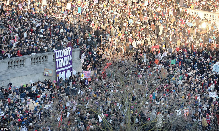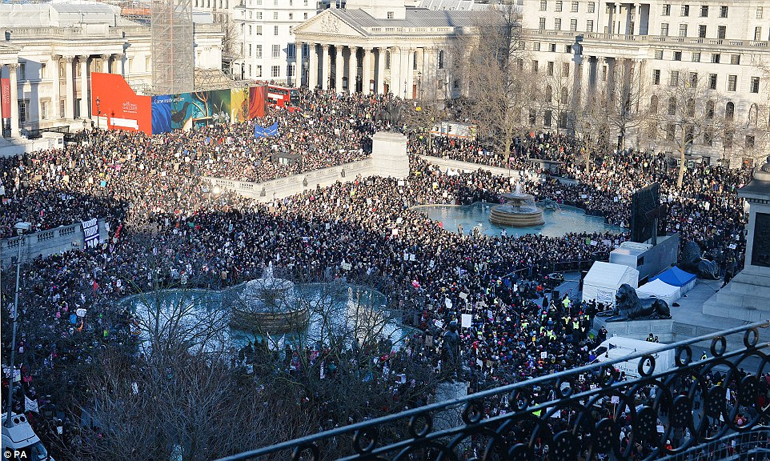 Στο Λονδίνο τα πλακάτ των διαδηλωτών έγραφαν μεταξύ άλλων: «Ειδική σχέση, απλώς πείτε όχι» και «Παλιογυναίκες, ενωθείτε» (σ.σ. από τον χαρακτηρισμό «nasty woman» που είχε χρησιμοποιήσει ο Τραμπ για τη Χίλαρι Κλίντον κατά τη διάρκεια της επεισοδιακής προεκλογικής περιόδου). Η κινητοποίηση πραγματοποιήθηκε έξω από την πρεσβεία των ΗΠΑ. Ακολούθησε πορεία μέχρι την πλατεία Τραφάλγκαρ.