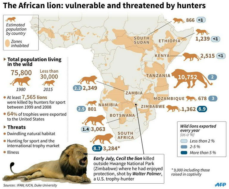 Λιγότερα από 30.000 λιοντάρια ζουν ελεύθερα στην άγρια φύση της Αφρικής εν έτει 2015, έναντι 75.800 το 1980, επισημαίνει το Γαλλικό Πρακτορείο με αφορμή τη δολοφονία του Σεσίλ από Αμερικανό τουρίστα που επιδιδόταν σε σαφάρι.