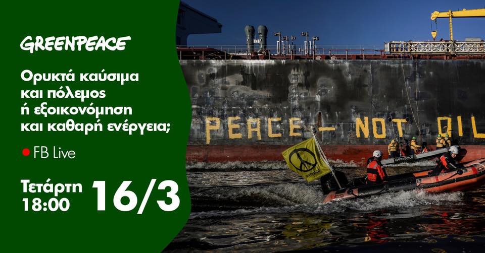 «Ορυκτά καύσιμα και πόλεμος ή εξοικονόμηση και καθαρή ενέργεια;» είναι ο τίτλος της διαδικτυακής συζήτησης που διοργανώνει το απόγευμα της Τετάρτης η Greenpeace Greece σε συνεργασία με το Ελληνικό Ινστιτούτο Παθητικού Κτηρίου.