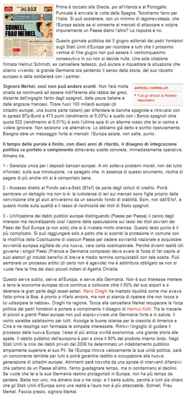 «Μπορεί να υποστηριχθεί ότι υπάρχει η Ευρώπη, εάν επιτρέπει στις αγορές να επιτίθενται και να πλήττουν τη μια χώρα μετά την άλλη; Η απάντηση είναι όχι» αναφέρει σε κύριο άρθρο της εφημερίδας ο Ρομπέρτο Ναπολετάνο, ο διευθυντής της, κάτω από τη φωτογραφία της καγκελαρίου και τη φράση «Γρήγορα, κυρία Μέρκελ» με κεφαλαία γράμματα.