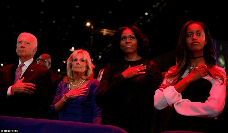 Ο απερχόμενος πρόεδρος φανερά συγκινημένος και με δάκρυα στα μάτια ευχαρίστησε τη σύζυγό του, διότι βρέθηκε σε μία θέση που, όπως είπε, δεν την επέλεξε. «Όλα αυτά τα χρόνια ήσουν σύντροφος, σύμβουλος, μητέρα των παιδιών μου… Εσύ έκανες τον Λευκό Οίκο μια ανοιχτή πόρτα για τον κόσμο» είπε απευθυνόμενος στη Μισέλ Ομπάμα.