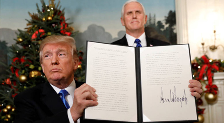 H ανακοίνωση του προέδρου των ΗΠΑ Ντ. Τραμπ και η υπογραφή του για τη μεταφορά της αμερικάνικης πρεσβείας στην Ιερουσαλήμ, σημαίνει την ντε φάκτο επίσημη αναγνώριση της ιερής πόλης για τρεις θρησκείες, ως πρωτεύουσας του Ισραήλ.