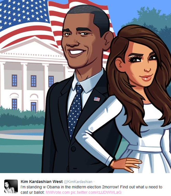 Το περίεργο είναι ότι η Κιμ επέλεξε να χρησιμοποιήσει μια καρτουνίστικη εικόνα του εαυτού της και του Προέδρου Ομπάμα, με τη λεζάντα της φωτογραφίας να λέει: «Στέκομαι δίπλα σου Ομπάμα στις ενδιάμεσες εκλογές αύριο!».