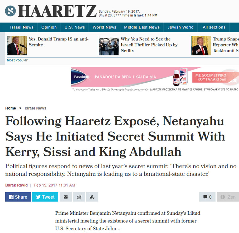 Ο πρωθυπουργός Μπενιαμίν Νετανιάχου συναντήθηκε μυστικά πριν από έναν χρόνο με τους ηγέτες της Αιγύπτου και της Ιορδανίας σε μια αποτυχημένη, όπως αποδείχθηκε, προσπάθεια της κυβέρνησης Ομπάμα να συγκαλέσει μια ευρύτερη περιφερειακή σύνοδο κορυφής για την επίτευξη ειρήνης στην ισραηλο-παλαιστινιακή σύγκρουση, γράφει σήμερα η ισραηλινή εφημερίδα Haaretz.