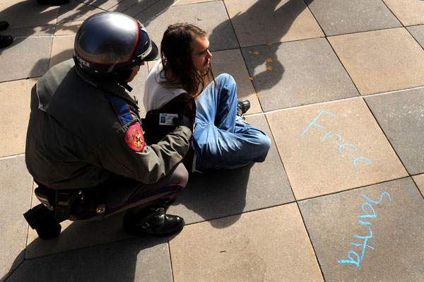 Αστυνομικοί προχώρησαν την περασμένη Παρασκευή στη σύλληψη ενός άνδρα, όταν ο τελευταίος αψήφησε τις εντολές τους και συνέχισε να γράφει με κιμωλία μηνύματα ειρήνης, χαράς και αλληλεγγύης πάνω σε πλάκες στον προαύλιο χώρο του Καπιτωλίου.