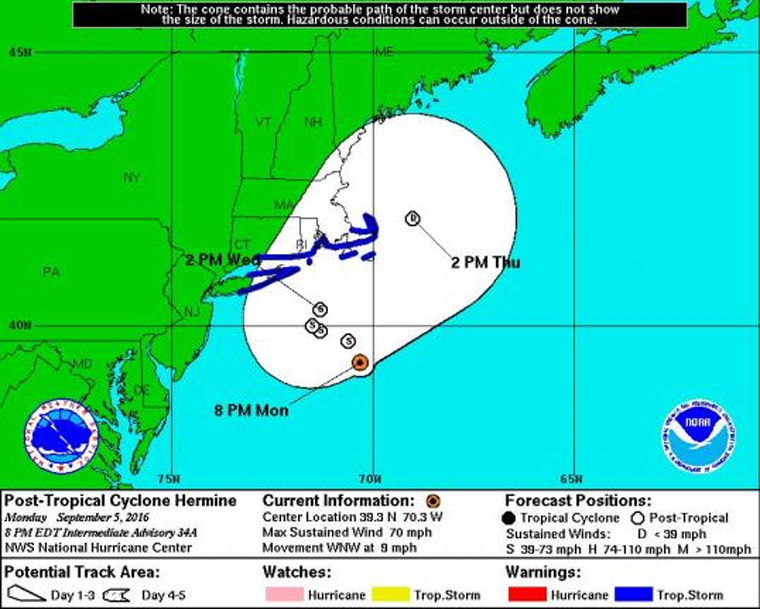 O τυφώνας «Ερμιόνη» κατευθυνόταν αργά το βράδυ της Δευτέρας (τοπική ώρα) προς τμήματα του «Rhode Island», περιοχές νότια της Μασαχουσέτης και μετέπειτα τις ανατολικές ακτές της Νέας Υόρκης.