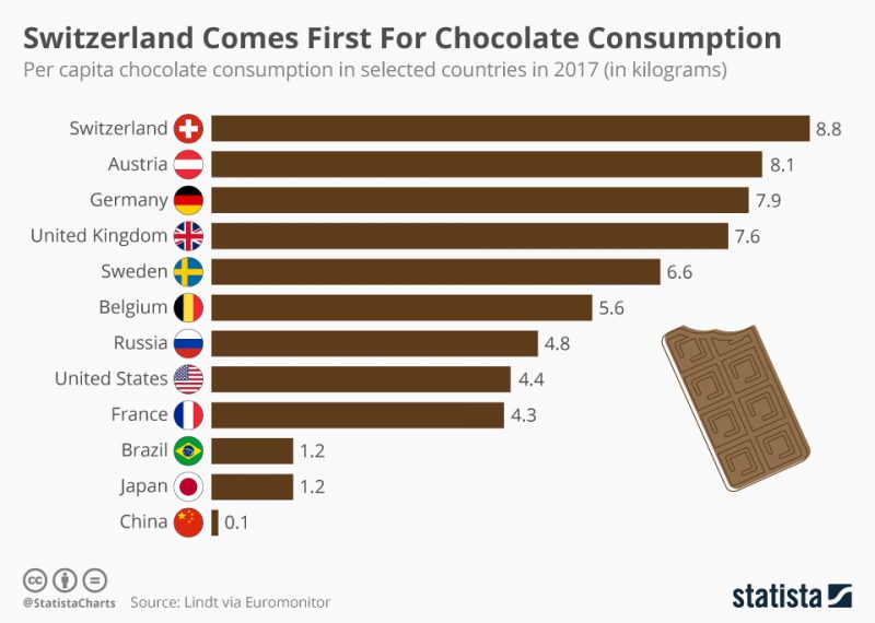Η Ελβετία βρίσκεται στην πρώτη θέση της λίστας που δημοσίευσε Statista.com σχετικά με τη μέση ποσότητα κατανάλωσης σοκολάτας κατά άτομο. Για την Ελβετία, η ποσότητα αυτή ανέρχεται στα 8,8 κιλά ανά άτομο – νούμερο που δικαιολογείται αν αναλογιστεί κανείς ότι η χώρα είναι γνωστή για την εξαιρετική βιομηχανία σοκολάτας, με την Toblerone μία από τις πιο αναγνωρίσιμες μάρκες της.