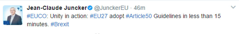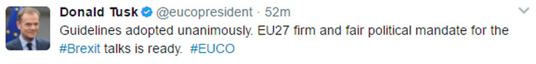 Οι ηγέτες των 27 χωρών-μελών της Ευρωπαϊκής Ένωσης συμφώνησαν ομόφωνα στις κατευθυντήριες γραμμές του σχεδίου που θα ακολουθήσουν οι Βρυξέλλες στις διαπραγματεύσεις για το Brexit, ανακοίνωσε ο πρόεδρος του Ευρωπαϊκού Συμβουλίου Ντόναλντ Τουσκ, με μήνυμά του στο Twitter.