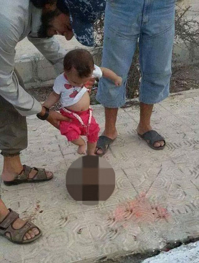 Αποτροπιασμό προκαλεί μια φωτογραφία που κάνει τον γύρο του διαδικτύου, στην οποία παρουσιάζεται ένας φερόμενος ως υποστηρικτής του Ισλαμικού Χαλιφάτου στη Συρία να βάζει ένα μωρό -πιθανώς το παιδί του- να κλοτσήσει το κεφάλι ενός αποκεφαλισμένου στρατιώτη.