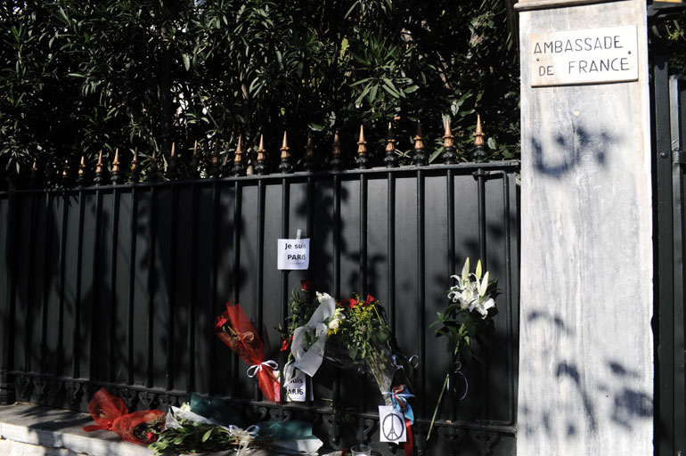 Λουλούδια και μηνύματα συμπαράστασης καταθέτουν από το πρωί του Σαββάτου στην είσοδο της γαλλικής πρεσβείας στην Αθήνα οι πολίτες, στον απόηχο των χθεσινών τρομοκρατικών επιθέσεων στο Παρίσι.