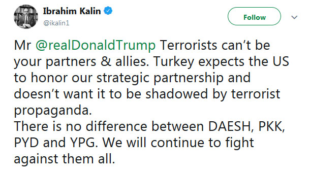 «Κύριε Ντόναλντ Τραμπ, είναι θανάσιμο σφάλμα να εξισώνονται οι Σύροι Κούρδοι με το PKK, που βρίσκεται στον κατάλογο των τρομοκρατικών οργανώσεων που καταρτίζουν οι ΗΠΑ, και με το συριακό παρακλάδι του, τις PYD/YPG» ανέφερε ο Καλίν σε ανάρτησή του στο Twitter, επισυνάπτοντας την ανάρτηση του Τραμπ.