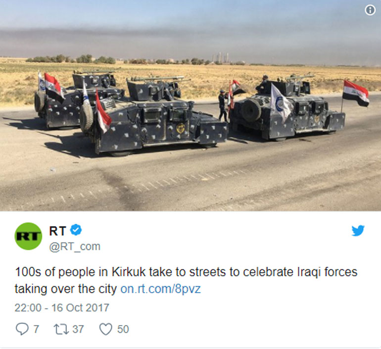 Ουδείς θα περίμενε μία τέτοια ανατροπή μέσα σε τόσο μικρό χρονικό διάστημα. Οι μαχητές Πεσμεργκά του Μπαρτζανί, του προέδρου των Κούρδων του βορείου Ιράκ, αποσύρθηκαν από την πόλη του Κιρκούκ χωρίς να ρίξουν ούτε σφαίρα και ο ιρακινός στρατός της Βαγδάτης, που αποτελείται στην πλειονότητά του από σιίτες, κατέλαβε όλα τα στρατηγικά σημεία της πόλης, το αεροδρόμιο και την πετροχημική βιομηχανία.