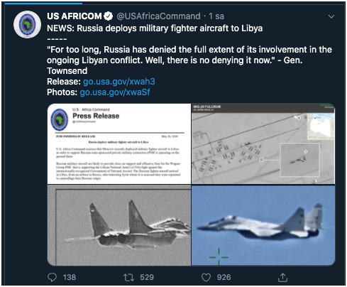 Στη δεύτερη φωτογραφία βλέπουμε το tweet του Αμερικανικού Πενταγώνου και της Διεύθυνσης Επιχειρήσεων Αφρικής Us Afri com και από κάτω το τιτλάκι: «Η Ρωσία αναπτύσσει στρατιωτικά μαχητικά στη Λιβύη». Ακριβώς από κάτω καταγράφεται το σχόλιο του στρατηγού Τοwnsend: «Για μεγάλο χρονικό διάστημα η Ρωσία διέψευδε την πραγματική διάσταση της εμπλοκής της στην εξελισσόμενη Λιβική κρίση. Ε, λοιπόν δεν είναι σε θέση η Ρωσία να την αρνείται εφεξής».