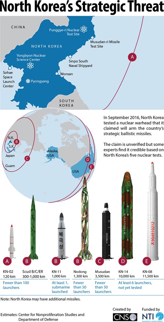 Οι πληροφορίες που διαθέτουν αυτήν τη στιγμή οι αμερικανικές υπηρεσίες αντικατασκοπείας επιμένουν ότι η Πιονγκγιάνγκ, που πραγματοποίησε την περασμένη Πέμπτη πυραυλική δοκιμή, μέσα σε δύο χρόνια ενδεχομένως να έχει έτοιμη πυρηνική κεφαλή που θα μπορούσε να φτάσει στο έδαφος των Ηνωμένων Πολιτειών. Η διοίκηση Αεροδιαστήματος Βόρειας Αμερικής, υπεύθυνη για την ασφάλεια της περιοχής, εκφράζει «πλήρη εμπιστοσύνη» στην αποτροπή οποιασδήποτε ενδεχόμενης απειλής από διηπειρωτικούς πυραύλους (ICBM) με στόχο τις ΗΠΑ.