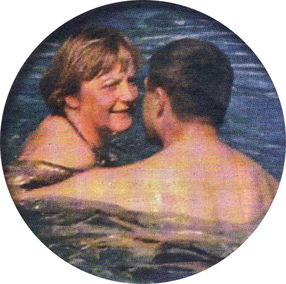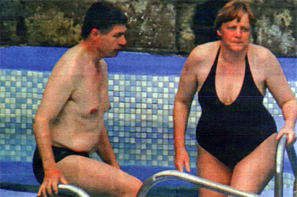 Την αγκαλιά του συζύγου της Γιοακίμ Σάουερ απολαμβάνει η Γερμανίδα καγκελάριος, η οποία εμφανίζεται να κολυμπά με ολόσωμο μαύρο μαγιό στην πισίνα πολυτελέστατου ξενοδοχείου στην Ιταλία.