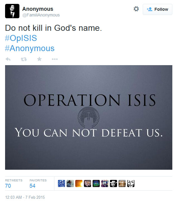 Στην αρχή της εκστρατείας τους κατά του Χαλιφάτου, είχαν διαρρεύσει στο διαδίκτυο το εξής μήνυμα: «Θα σας κυνηγήσουμε, θα κατεβάσουμε τις ιστοσελίδες σας από το διαδίκτυο, θα απενεργοποιήσουμε λογαριασμούς σας σε ηλεκτρονικά ταχυδρομεία και social media, και θα σας εκθέσουμε. Απο εδώ και πέρα δεν υπάρχει ασφαλές μέρος για εσάς στο διαδίκτυο. Θα σας αντιμετωπίσουμε σαν ιό και εμείς είμαστε η θεραπεία του. Το διαδίκτυο μας ανήκει. Είμαστε οι Anonymous, είμαστε λεγεώνα. Δεν συγχωρούμε και δεν ξεχνάμε. Να μας περιμένετε»