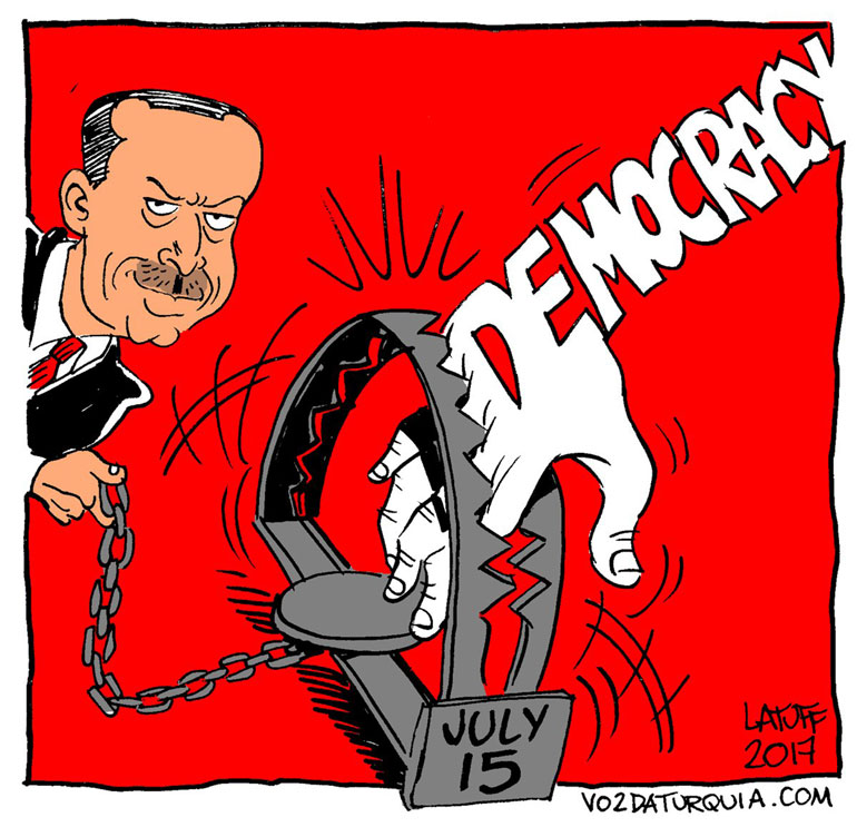 Η διεθνής εμπλοκή του Ερντογάν με το Twitter άρχισε με τον Βραζιλιάνο σκιτσογράφο Κάρλος Λατούφ, ο οποίος βάλθηκε να τον αποδομήσει με την τέχνη του. Δημοσιεύοντας σκίτσα που τον δείχνουν να κλέβει χρηματοκιβώτια, να παγιδεύει σε δόκανο τη δημοκρατία, να φυλακίζει, να εξορίζει και γενικώς να γράφει στα παλιά του τα παπούτσια κράτος, αρχές, Σύνταγμα, πολιτική ηθική.