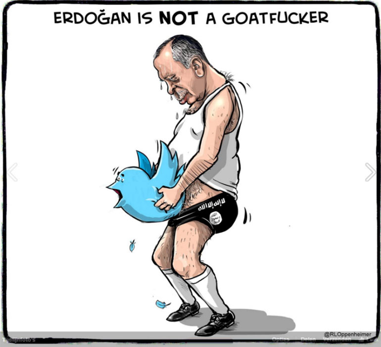 Ο Ερντογάν έγινε έξαλλος και αποφάσισε να κυνηγήσει δικαστικά τον Λατούφ απειλώντας με θεούς και δαίμονες, του Ισλάμ προφανώς, το Twitter. Τι ήθελε και το ‘κανε; Μετά τον Λατούφ άρχισαν και άλλοι σκιτσογράφοι να παίρνουν μέρος στο πάρτυ, γελιοποιώντας τον Ερντογάν. Τελευταίο απόκτημα στην προσωπική collection των καλλιτεχνικών δημιουργιών που αφιερώνονται στον χαλίφη της Αγκύρας είναι το έργο του Ολλανδού σκιτσογράφου Ρούμπεν Οπενχάιμερ ο οποίος του αφιερώνει το καλλιτεχνικό του μένος, παρουσιάζοντας τον πρόεδρο της Τουρκίας σε ερωτικό παροξυσμό. Οργισμένος ο Ταγίπ Ερντογάν με το Twitter ξεσπά το ερωτικό του πάθος ανασκολοπίζοντας το γνωστό γαλάζιο πουλάκι σύμβολο. Καταϊδρωμένος ο Ταγίπ Ερντογάν εμφανίζεται να αγκομαχά και το πουλάκι να σπαρταράει.