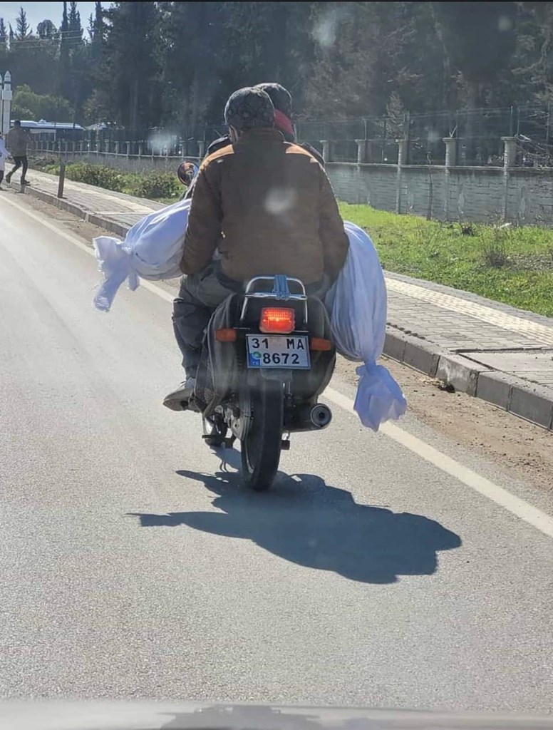 Πάνω στο μηχανάκι με πινακίδες κυκλοφορίας από την Αντιόχεια δύο νέοι άνδρες μεταφέρουν την σορό συγγενούς τους που είναι περιτυλιγμένη με ένα σεντόνι. Προφανώς πριν από λίγο είχαν αναγνωρίσει τον δικό τους άνθρωπο σε κάποιο από τα υπαίθρια νεκροτομεία και τώρα τον μεταφέρουν για να τον ενταφιάσουν όπου τους υποδείξουν.