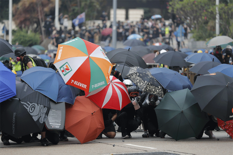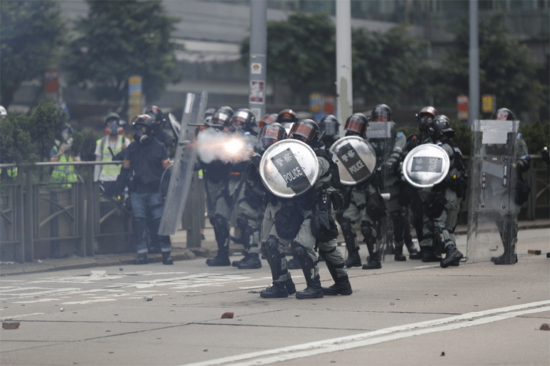 Η αστυνομία το βράδυ του Σαββάτου εκτόξευσε δακρυγόνα και έκανε χρήση αντλιών νερού για να διαλύσει τους διαδηλωτές που πέταξαν βόμβες μολότοφ και πέτρες, έσπασαν παράθυρα σε κυβερνητικά κτίρια και απέκλεισαν βασική οδική αρτηρία κοντά στο τοπικό αρχηγείο του Λαϊκού Απελευθερωτικού Στρατού της Κίνας.