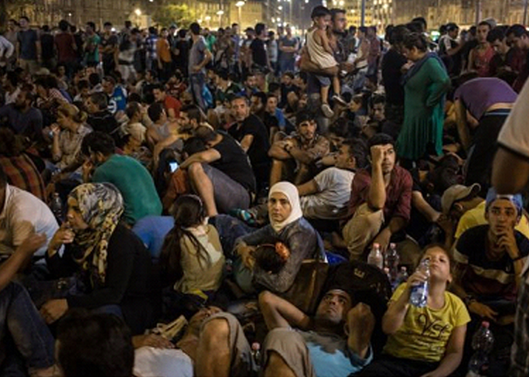 Εκατοντάδες μετανάστες έξω από τον κεντρικό σιδηροδρομικό σταθμό της Βουδαπέστης, που παραμένει κλειδωμένος από την αστυνομία για να εμποδίσει να συνεχίσουν προς τις άλλες ευρωπαϊκές χώρες, κάνοντας το ταξίδι τους αφόρητο.