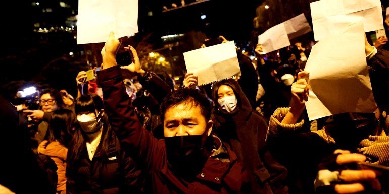 Το κύμα διαδηλώσεων σε ολόκληρη την Κίνα, που απαιτούν τον τερματισμό των δρακόντειων μέτρων μηδενικού Covid, δεν μοιάζει με κάτι που να έχει δει η χώρα εδώ και δεκαετίες. Από τις πανεπιστημιουπόλεις μέχρι τους πολυσύχναστους δρόμους στις περιοχές του κέντρου της πόλης, οι άνθρωποι κρατούσαν κομμάτια λευκού χαρτιού ως σύμβολο διαμαρτυρίας, μετά από μια φονική πυρκαγιά σε μια γειτονιά του Σιντζιάνγκ – που βρίσκεται σε σκληρό lockdown. Οι πιο δραματικές στιγμές συνέβησαν το Σαββατοκύριακο, όταν οι διαδηλωτές ακούγονταν να φωνάζουν «Xi Jinping, παραιτήσου».