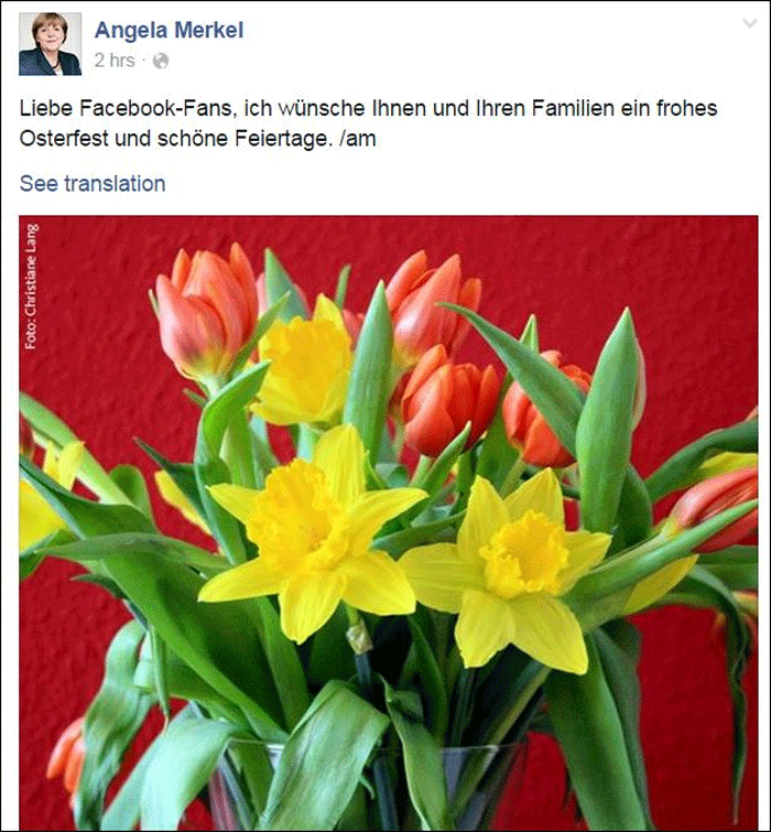 «Αγαπητοί φίλοι μου στο facebook, εύχομαι σε εσάς και τις οικογένειές σας καλό Πάσχα και καλές διακοπές», έγραψε απλά και… λιτά η καγκελάριος της Γερμανίας αναρτώντας και μία φωτογραφία με λουλούδια.