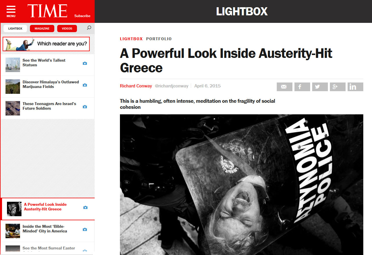 Οι εικόνες, αναφέρει το Time, είναι τόσο δυνατές, όσο και σοκαριστικές. «Ο φωτογράφος μας δείχνει τα πάντα: Aπό τις διαδηλώσεις, συγκεντρώσεις της Χρυσής Αυγής μέχρι γυναίκες που εργάζονται ως ιερόδουλες, από μετανάστες που ψάχνουν καταφύγιο, μέχρι τοξικομανείς στα υπνοδωμάτιά τους», τονίζει το περιοδικό.