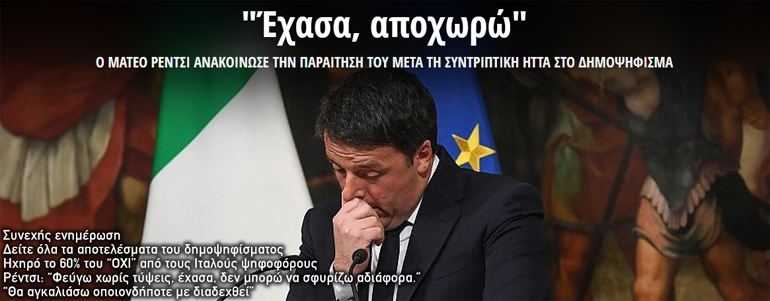 Οι πολίτες απέρριψαν με την ψήφο τους τις προτάσεις Ρέντσι για τη συνταγματική αναθεώρηση σ’ ένα δημοψήφισμα που ήταν κάτι πολύ περισσότερο από το αν θα μειωθούν τα μέλη της Γερουσίας ή αν θα απονέμεται με ταχύτερους ρυθμούς η δικαιοσύνη.