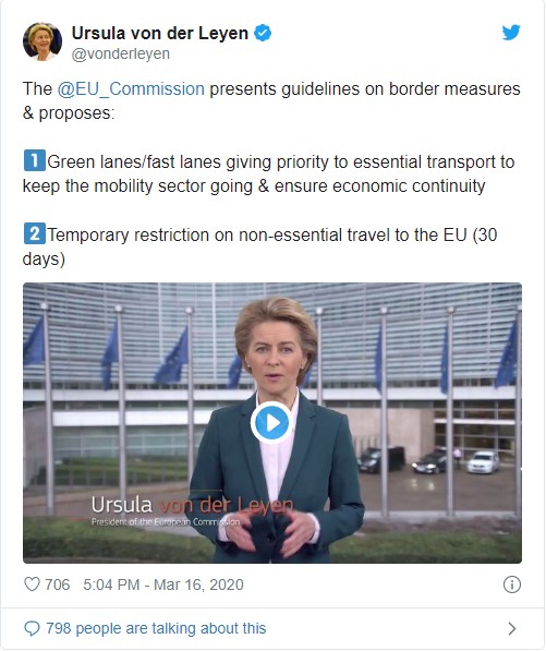 «Όσο λιγότερα τα ταξίδια, τόσο περισσότερο μπορούμε να περιορίσουμε τον ιό. Κατά συνέπεια προτείνω στους αρχηγούς κρατών και κυβερνήσεων να εισάγουμε προσωρινούς περιορισμούς στα μη αναγκαία ταξίδια στην ΕΕ» ανέφερε η ντερ Λάιεν. «Αυτοί οι ταξιδιωτικοί περιορισμοί θα πρέπει να ισχύσουν για περίοδο 30 ημερών, αλλά μπορούμε να την παρατείνουμε αν είναι αναγκαίο», πρόσθεσε.