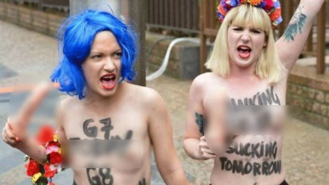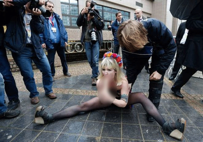 Σε μια ακόμη πρωτότυπη διαμαρτυρία προχώρησαν οι γυμνόστηθες ακτιβίστριες της οργάνωσης Femen έξω από το κτίριο του Ευρωπαϊκού Συμβουλίου.