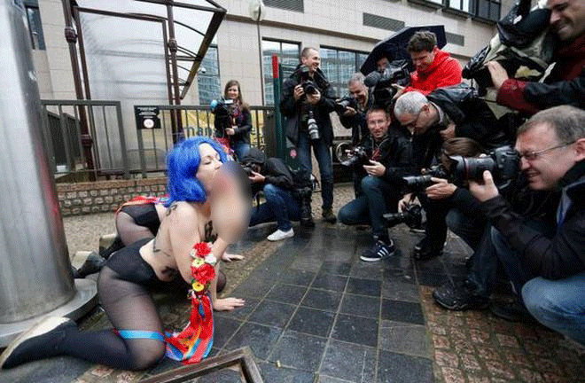 Το περιστατικό κατέγραψαν δεκάδες φωτογράφοι αλλά και τηλεοπτικά συνεργεία ενώ λίγη ώρα αργότερα οι Femen απομακρύνθηκαν από αστυνομικές δυνάμεις.
