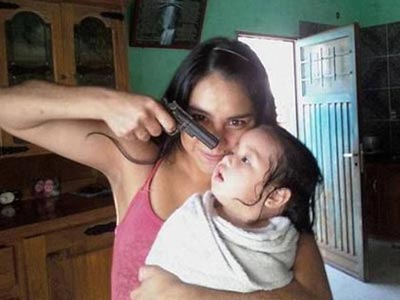 Η φωτογραφία δείχνει μια νεαρή γυναίκα, να χαμογελά κρατώντας ένα πιστόλι (αληθινό ή ψεύτικο) ακριβώς ανάμεσα στα μάτια ενός παιδιού ηλικίας περίπου δύο ετών.
