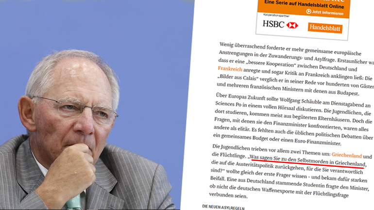 Στο άκουσμα της ερώτησης, σύμφωνα με τη γερμανική «Ηandelsblatt», παρευρισκόμενοι άρχισαν να χειροκροτούν και ο Σόιμπλε απάντησε ως εξής: