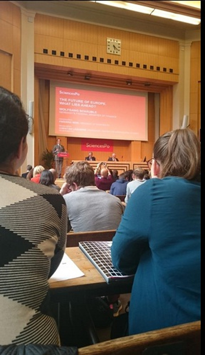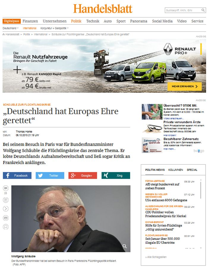 Τα «καυτά» ζητήματα της Ελλάδας και των προσφύγων τέθηκαν επί τάπητος σε συνάντηση του Γερμανού υπουργού Οικονομικών Βόλφγκανγκ Σόιμπλε με Γάλλους φοιτητές του Πανεπιστημίου «Sciences Po» στο ΠαρίσιΜιλώντας ενώπιον των φοιτητών, ο κ. Σόιμπλε υπεραμύνθηκε της πολιτικής της Γερμανίας για το προσφυγικό λέγοντας ότι η χώρα του έσωσε κατά κάποιον τρόπο την «τιμή» της Ευρώπης.