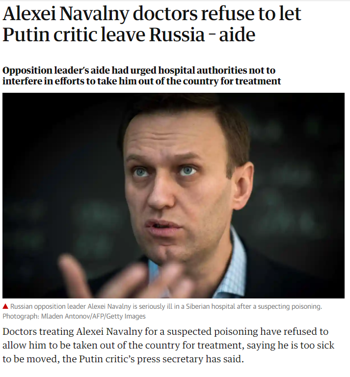 Όπως αναφέρει ο Guardian, Ρώσοι γιατροί δήλωσαν πως η κατάσταση του Ναβάλνι εξακολουθεί να είναι πολύ ασταθής για να μπορέσει να ταξιδέψει ο επικριτής του Κρεμλίνου, όμως σύμμαχοι του Ναβάλνι κατηγόρησαν τις αρχές ότι προσπαθούν να ματαιώσουν την ιατρική μεταφορά του, μια απόφαση η οποία λένε πως τον θέτει σε άμεσο θανάσιμο κίνδυνο.