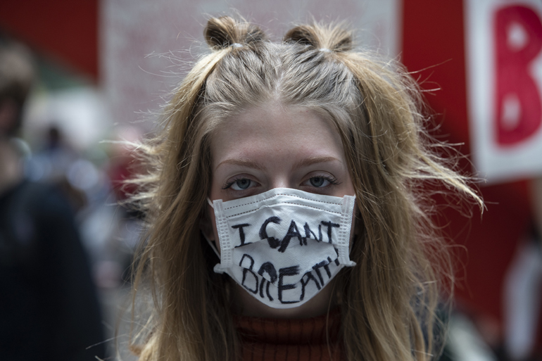 Οι διαδηλωτές φώναζαν «Black Lives Matter» και «I Can’t Breath» (τις τελευταίες λέξεις του Τζορτζ Φλόιντ πριν ξεψυχήσει κάτω από το γόνατο του αστυνομικού Ντέρεκ Σόβιν).