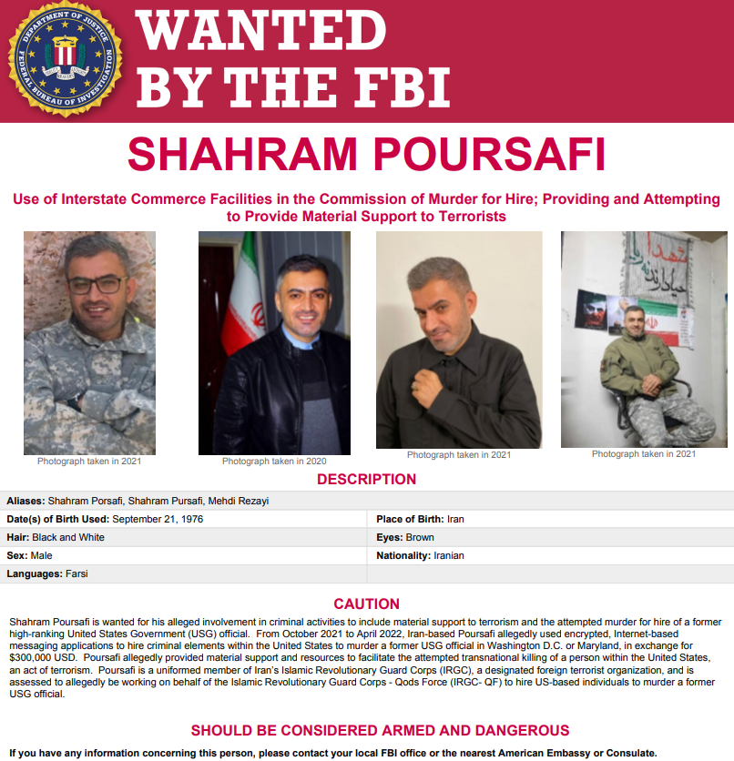 Το FBI εξέδωσε ένταλμα σύλληψης για τον Σαχράμ Πουρσαφί με φωτογραφίες, δυο εκ των οποίων τον δείχνουν να φορά τη στολή των Φρουρών της Επανάστασης.