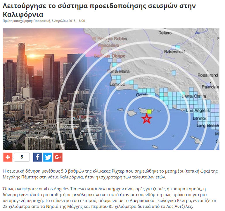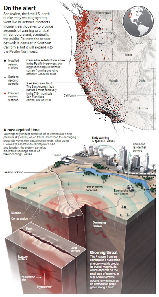 Το ShakeAlert, το πρώτο στις ΗΠΑ σύστημα έγκαιρης προειδοποίησης για σεισμό, τέθηκε σε λειτουργία στην Καλιφόρνια τον Οκτώβριο. Ανιχνεύει τον επερχόμενο σεισμό και θα παρέχει έστω λίγα δευτερόλεπτα προειδοποίησης, αρχικά για τις ζωτικές υποδομές, όπως οι μονάδες ηλεκτροπαραγωγής.