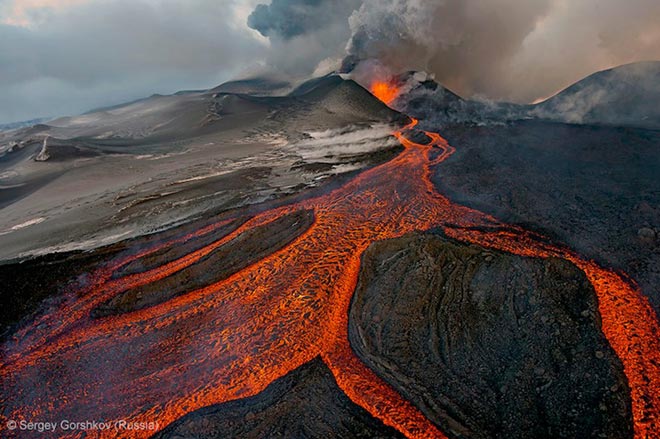 Πετώντας προς το ηφαίστειο, το νέφος της σκόνης, του καπνού και του ατμού δεν του επέτρεπαν να δει τον κρατήρα. Αλλά μία στο τόσο ένας δυνατός άνεμος παραμέριζε τα σύννεφα και μπορούσε να δει τον ύψους 200 μέτρων πίδακα λάβας, που ξεχύνονταν από τον κρατήρα και τα καυτά ποτάμια. Ο Sergey δηλώνει, πως η έκρηξη του Τόλμπατσικ είναι ότι πιο εντυπωσιακό έχει δει στη ζωή του.